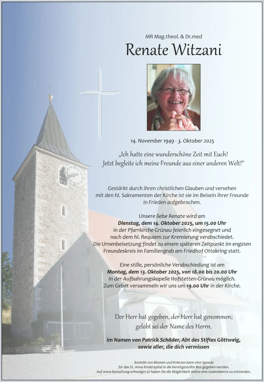 Renate Witzani war anerkannte Fachärztin und hat nach ihrer Pensionierung noch Theologie studiert und in ihrer Heimatgemeinde mitgewirkt.